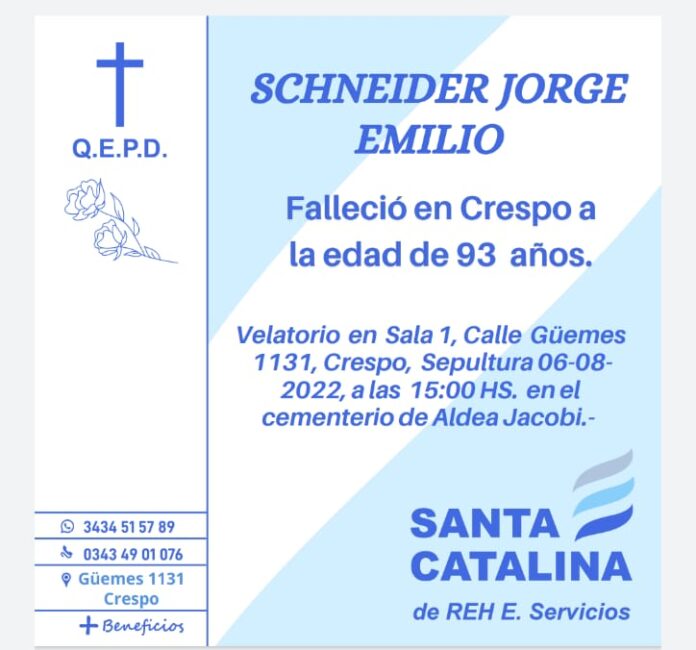 Defunción: Jorge Emilio Schneider Falleció en Crespo a los 93 años. 6 de agosto de 2022 Facebook Twitter WhatsApp Falleció en Crespo a los 93 años, Jorge Emilio Schneider. Sus restos son velados en sala Sargento I de calle Güemes 1131 de Crespo y serán sepultados, a las 15:00 en Cementerio de Aldea Jacobi. Facebook Twitter WhatsApp