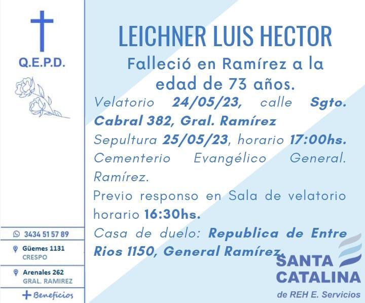 Falleció en General Ramírez a los 73 años, Luis Héctor Leichner.