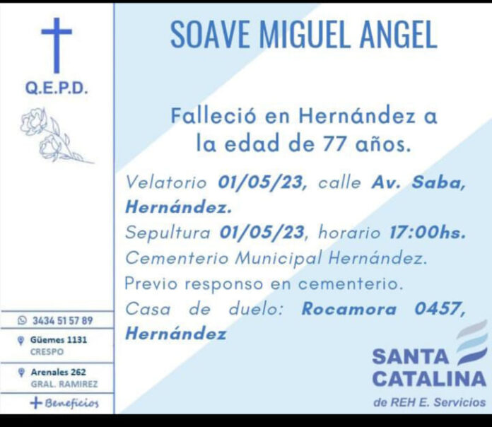 Falleció en Hernández a los 77 años, Miguel Ángel Soave.
