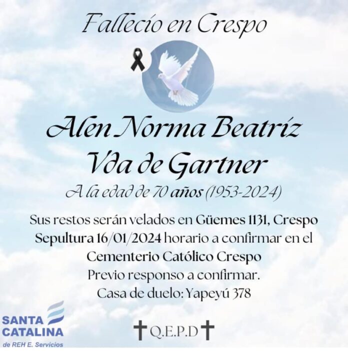 Falleció en Crespo a los 70 años, Norma Beatriz Alen viuda de Gartner.
