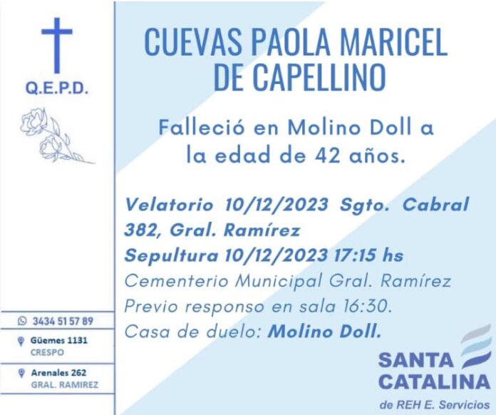 Falleció en Molino Doll a los 42 años, Paola Maricel Cuevas de Capellino.