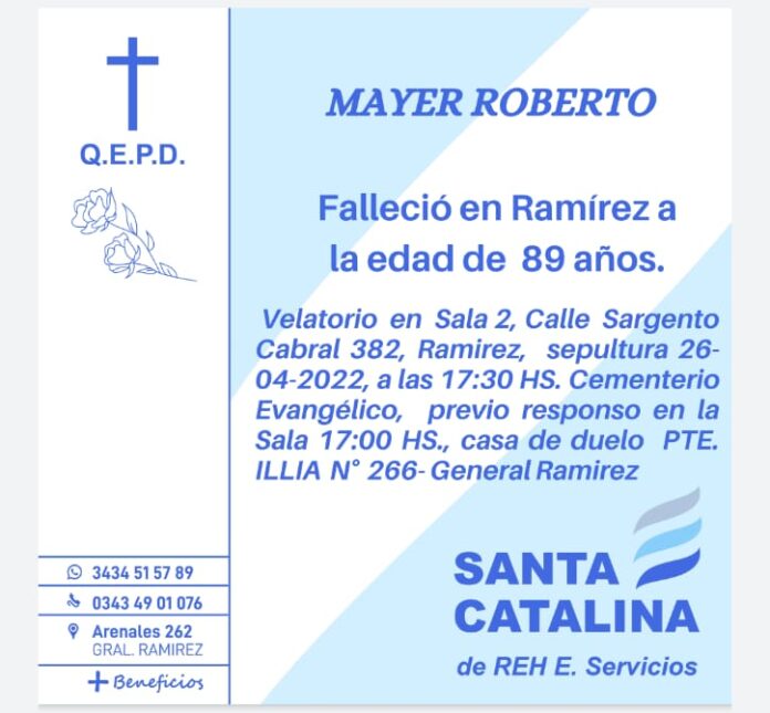 Falleció en Ramírez a los 89 años, Roberto Mayer.