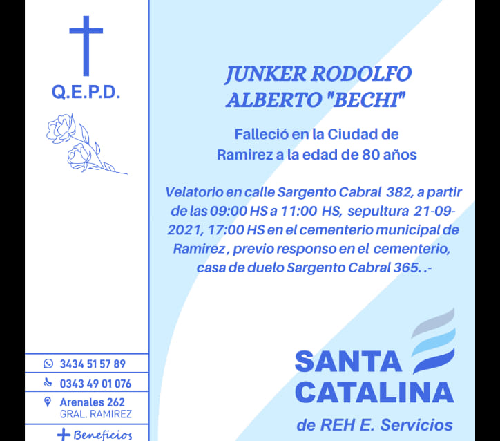 Falleció en Ramírez a los 80 años, Rodolfo Alberto Junker «Bechi».
