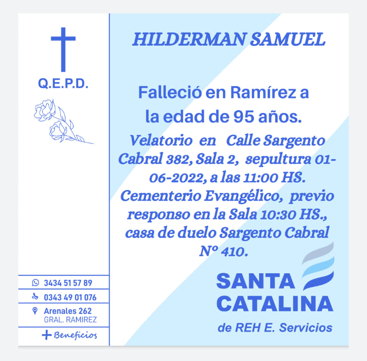 Sus restos son velados en sala de calle Sargento Cabral 382, Sala 2 y serán sepultados este miércoles 1º de junio a las 11.00 en el Cementerio Evangélico, previo responso en la sala a las 10.30.