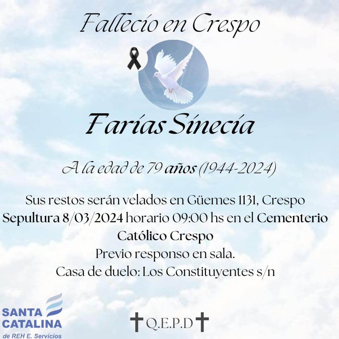 Falleció en Crespo a los 79 años, Sínecía Farías.