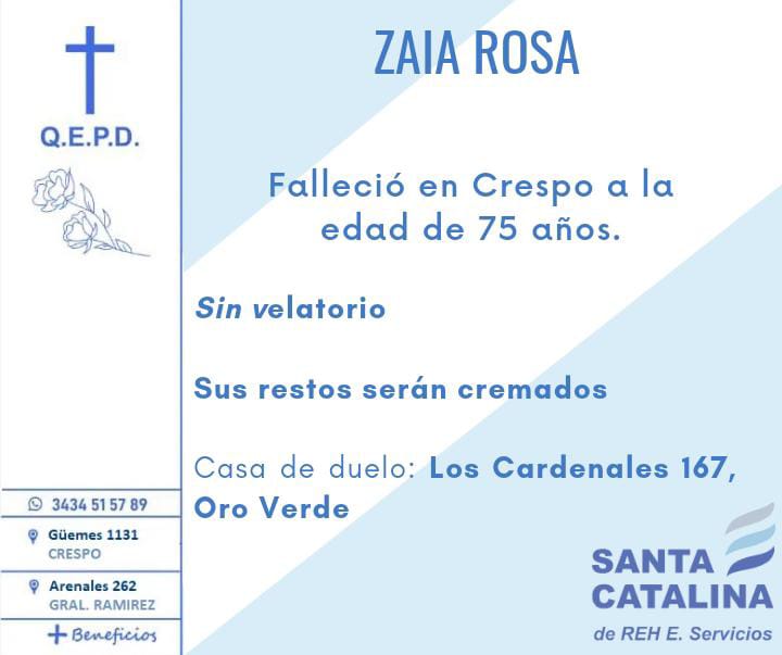 Defunción: Zaia Rosa (Q.E.P.D.) Falleció en Crespo a los 75 años 17 de enero de 2023 Facebook Twitter WhatsApp Falleció en Crespo a los 75 años, Zaia Rosa. Sus restos serán Cremados. Atención de Empresa Santa Catalina de Reh E. Servicios Facebook Twitter WhatsApp