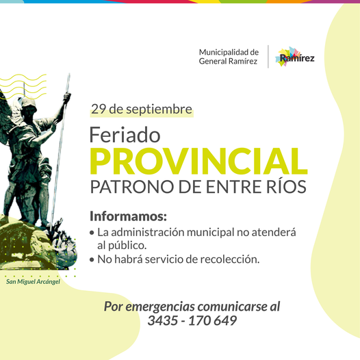 Cada 29 de septiembre -mediante el Decreto 4359/93 MGJE- es feriado en la provincia, por conmemorarse la festividad del Patrono San Miguel Arcángel.