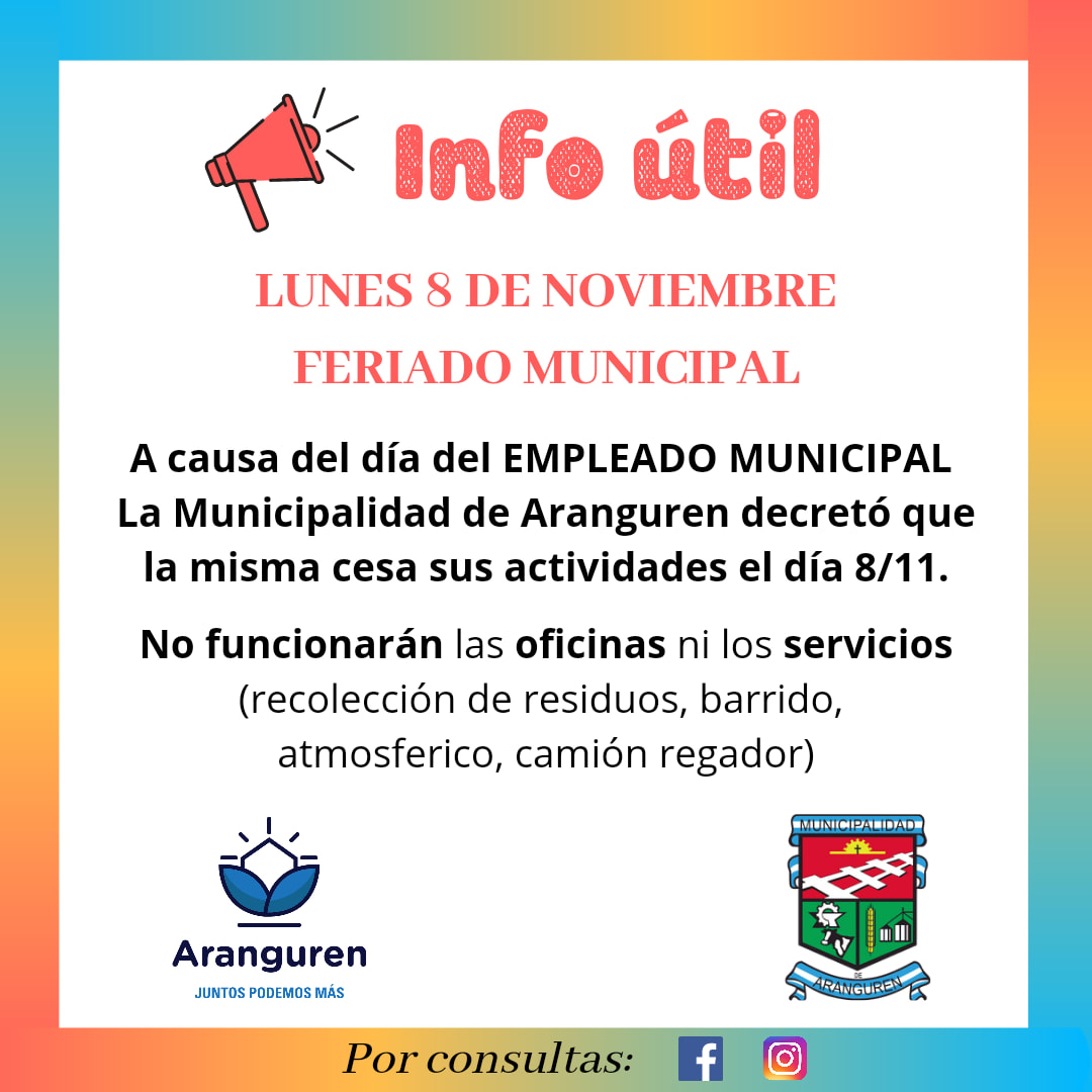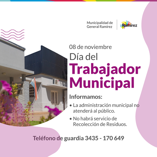 Por su parte en Aranguren sucederá algo similar. Estarán cerradas las oficinas y no funcionarán los servicios de recolección de residuos, barrido, atmosférico y regador. El martes se retomará el trabajo con normalidad.
