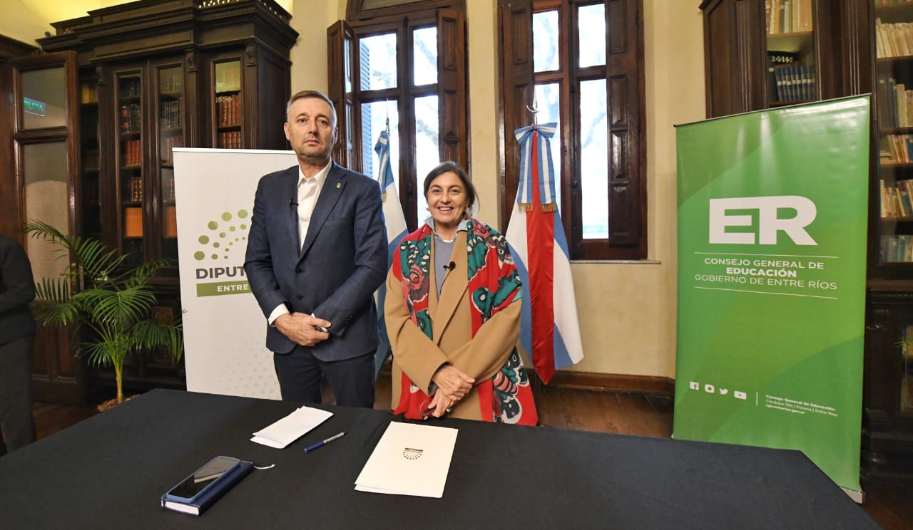Durante un acto realizado este jueves en el Salón de los Pasos Perdidos, el presidente de la Cámara de Diputados de Entre Ríos, Gustavo Hein, y su par del Consejo General de Educación (CGE), Alicia Fregonese, rubricaron dos convenios de cooperación que permitirán actividades en conjunto para promover el desarrollo y la construcción de ciudadanía. Estos acuerdos harán posible la puesta en marcha del programa de radio Visionarios, en el que estudiantes secundarios de la provincia abordarán temáticas relacionadas con el quehacer legislativo.