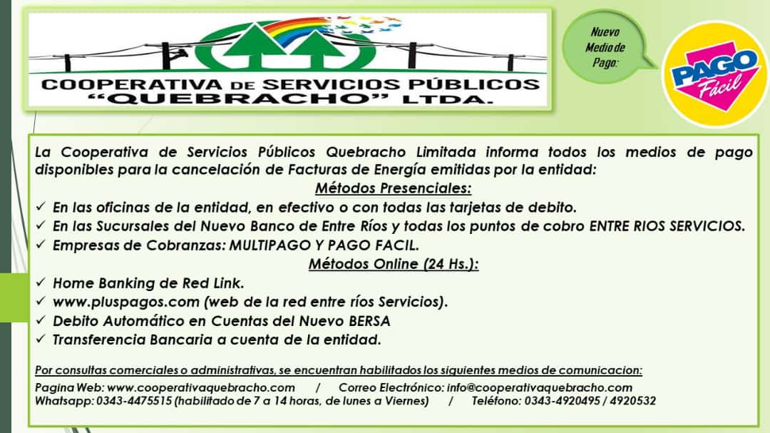 Dónde pagar las facturas de energía de Cooperativa Quebracho