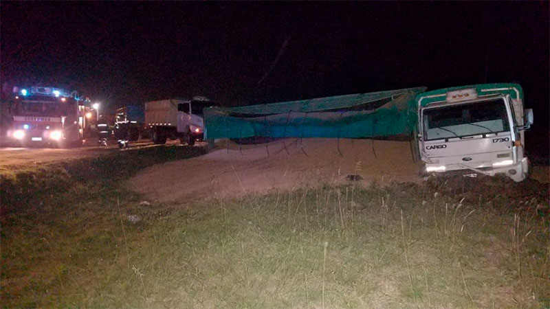 Por razones que se tratan de establecer, dos camiones, que se trasladaban desde en sentido este-oeste, chocaron fuertemente entre sí. El impacto provocó el despiste de uno de los rodados. Además, volcó el acopado y espació la carga de cereales sobre la banquina.