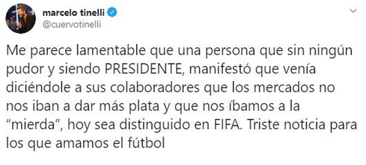 Por su parte, Marcelo Tinelli publicó: “Me parece lamentable que una persona que sin ningún pudor y siendo PRESIDENTE, manifestó que venía diciéndole a sus colaboradores que los mercados no nos iban a dar más plata y que nos íbamos a la mierda”, hoy sea distinguido en FIFA. Triste noticia para los que amamos el fútbol».