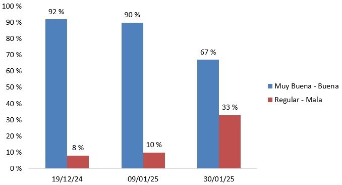 Desde la última evaluación, se ha observado una disminución en la suma de las categorías muy buena y buena, que pasó del 90% al 67%, mientras que la suma de las categorías regular y mala aumentó del 10% al 33%.