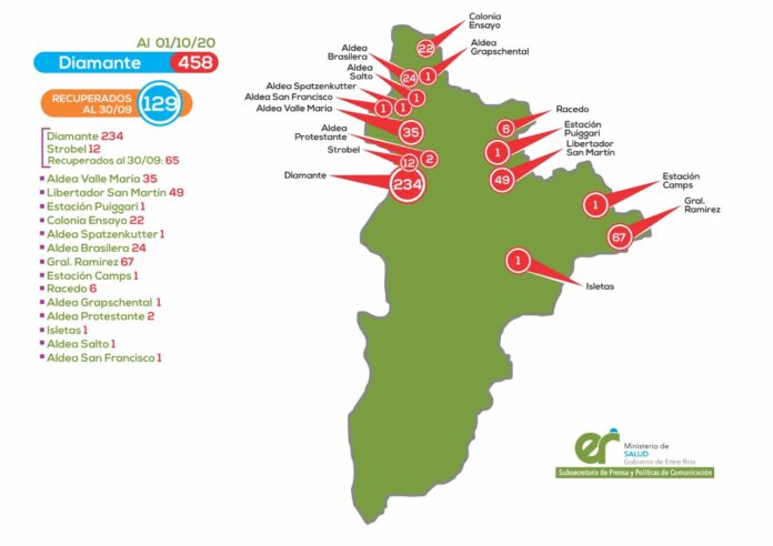 Desde el inicio de la pandemia, las localidades con más contagios son Diamante, 234; General Ramírez, 67; Libertador San Martín, 49; Aldea Valle María, 35 y Aldea Brasilera, 24.