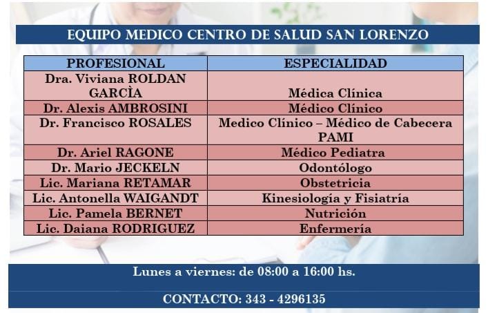 Desde el Centro de Salud San Lorenzo de la localidad de Isletas, dieron a conocer los nombres y especialidades del equipo médico que brinda sus servicios en el centro asistencial.