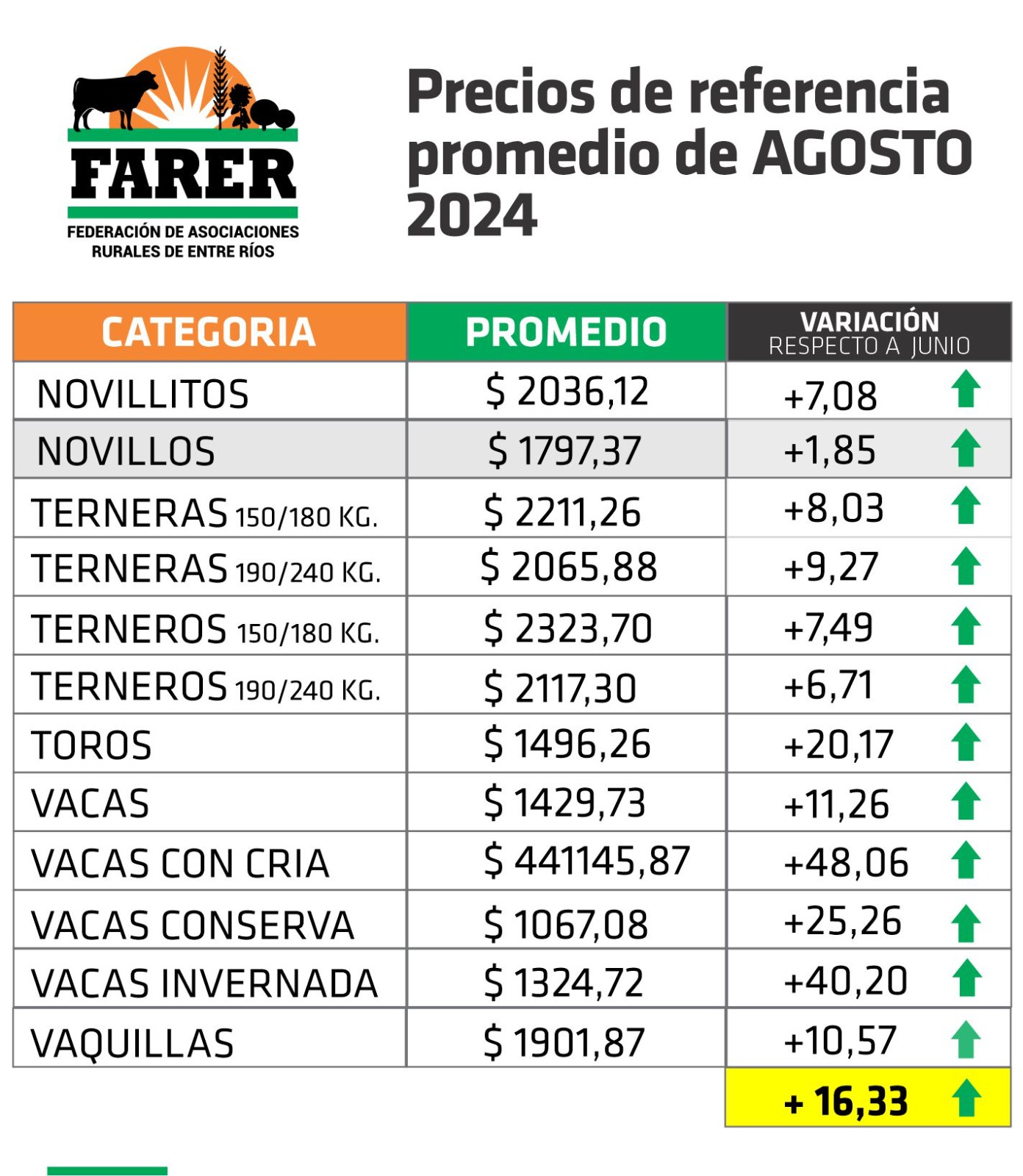 La Federación de Asociaciones Rurales de Entre Ríos (FARER) brindó los valores promedios que arrojaron los diversos remates de hacienda en pie desarrollados en el mes de agosto en las instalaciones ferias de las sociedades rurales entrerrianas.