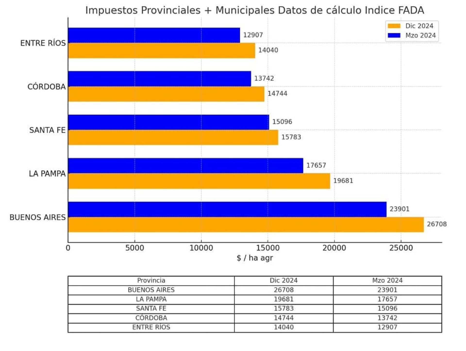El informe destaca que Entre Ríos tiene los impuestos provinciales por hectárea agrícola más bajos de la región centro, representando sólo el 4,7 por ciento de la carga fiscal total, en comparación con el 67,5 por ciento correspondiente a impuestos nacionales, como los Derechos de Exportación.