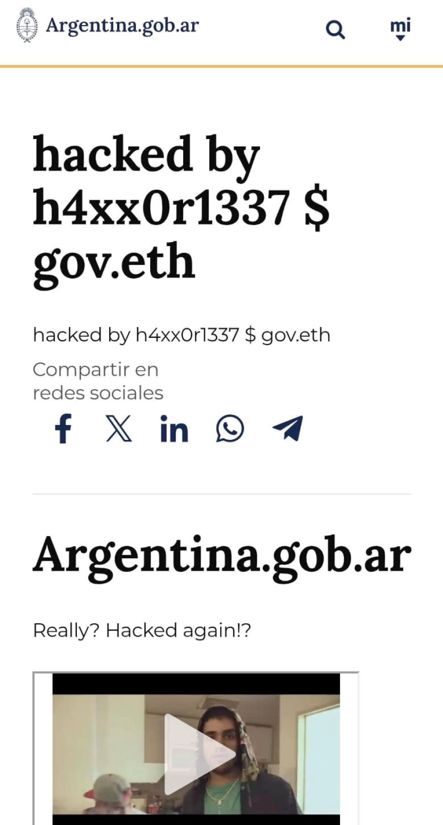 Los ciberdelincuentes identificados como “h4xx0r1337 $gov.eth” dejaron mensajes en torno burlesco indicando “really? hacked again!?” (¿de verdad? ¿hackeado de nuevo?). Además, en el pie de página del portal incluyeron un mensaje en contra del mandatario al publicar “fuck Milei”.
