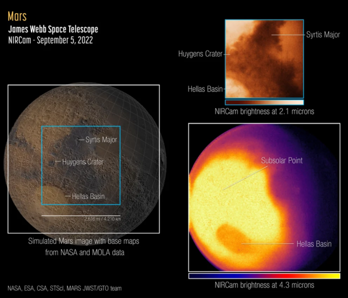La imagen de longitud de onda más corta (2,1 micrones) de NIRCam está dominada por la luz solar reflejada y, por lo tanto, revela detalles de la superficie similares a los que aparecen en las imágenes de luz visible. Los anillos del cráter Huygens, la roca volcánica oscura de Syrtis Major y el brillo en la cuenca Hellas son evidentes en esta imagen. La imagen NIRCam de longitud de onda más larga (4,3 micras) [abajo a la derecha] muestra la emisión térmica: la luz emitida por el planeta a medida que pierde calor. El brillo de la luz de 4,3 micras está relacionado con la temperatura de la superficie y la atmósfera. La región más brillante del planeta es donde el Sol está casi arriba, porque generalmente es más cálida. El brillo disminuye hacia las regiones polares, que reciben menos luz solar, y se emite menos luz desde el hemisferio norte, más frío, que experimenta el invierno en esta época del año.