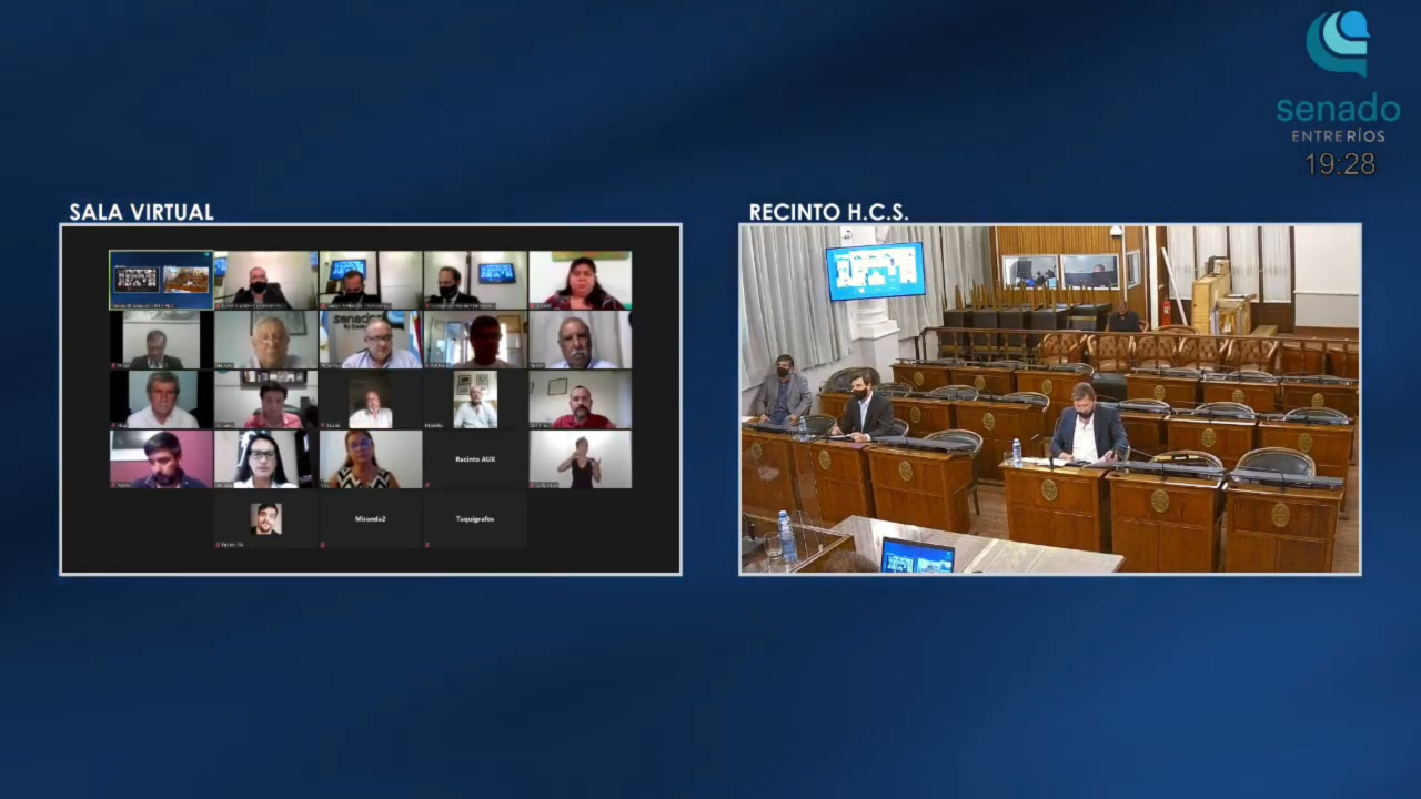 La Cámara de Senadores de la Provincia celebró este martes la primera sesión de prórroga del 141º período legislativo. El debate fue presidido desde el Recinto por el vicepresidente 1º del cuerpo, senador Daniel Olano (Islas del Ibicuy- Frente Justicialista), acompañado el secretario y prosecretario Lautaro Schiavoni y Leonardo Centurión respectivamente; además, estuvieron presentes los presidentes de bloque Armando Gay (Concordia-Frente Justicialista) y Francisco Morchio (Gualeguay- Cambiemos). El resto de las y los senadores asistieron a la sesión mediante videoconferencia.