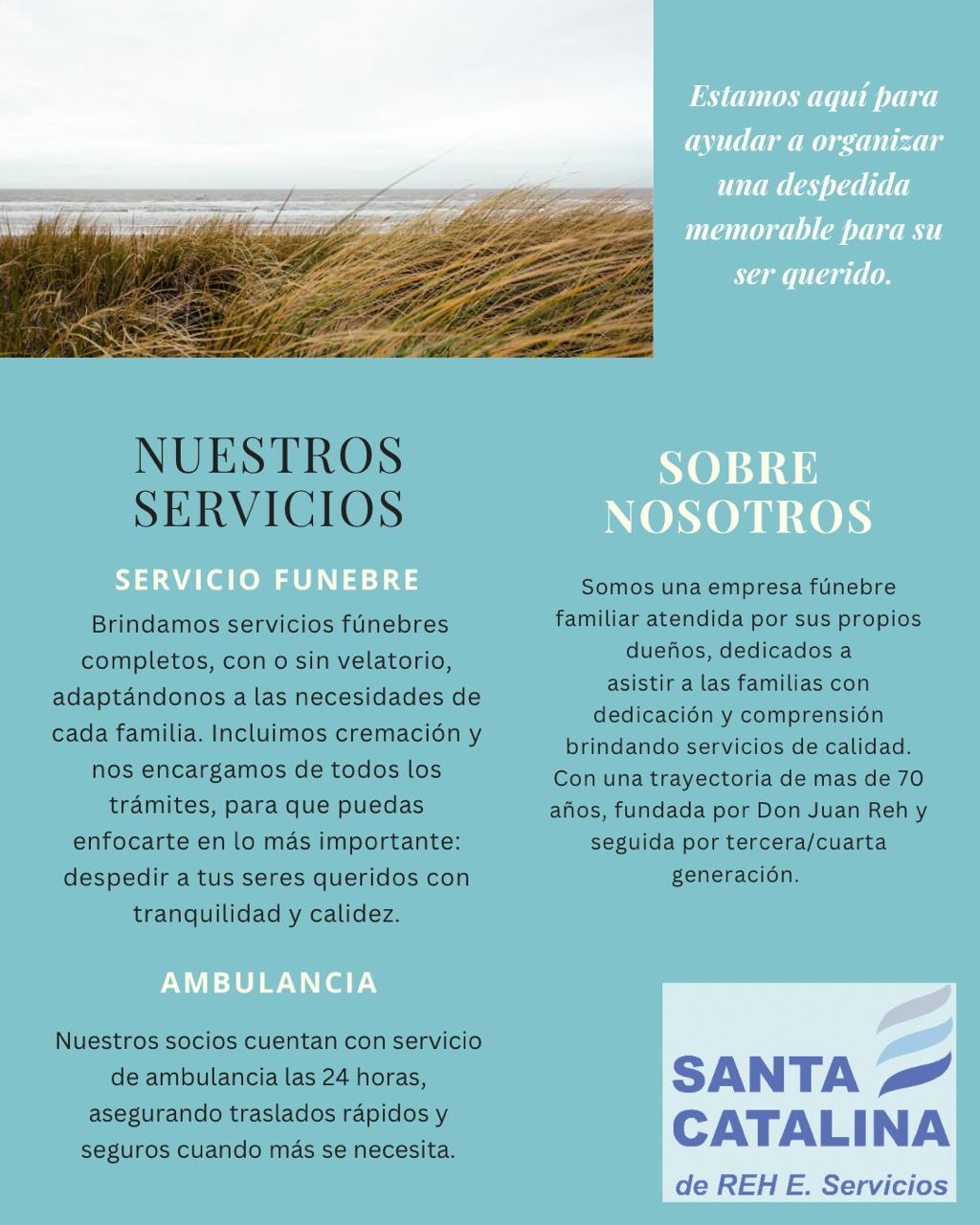 La empresa de servicios sociales Santa Catalina de Evelyn Reh e Hijos, es reconocida no solamente en General Ramírez, sino en la región, por su trayectoria, seriedad y eficiencia a la hora de brindar servicios fúnebres.