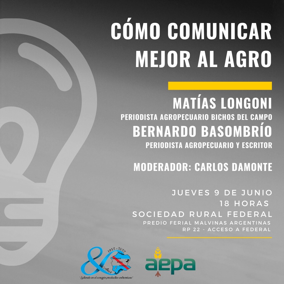 La Asociación Entrerriana de Periodistas Agropecuarios -AEPA- junto a la Sociedad Rural de Federal invitan a participar de la charla “Cómo comunicar mejor al agro”, a cargo de dos referentes del periodismo agropecuario como son Matías Longoni y Bernardo Basombrío. Será el jueves 9 de junio, a las 18, en el predio ferial de la Sociedad Rural de Federal (Ruta Provincia Nº22, en el acceso a la ciudad).