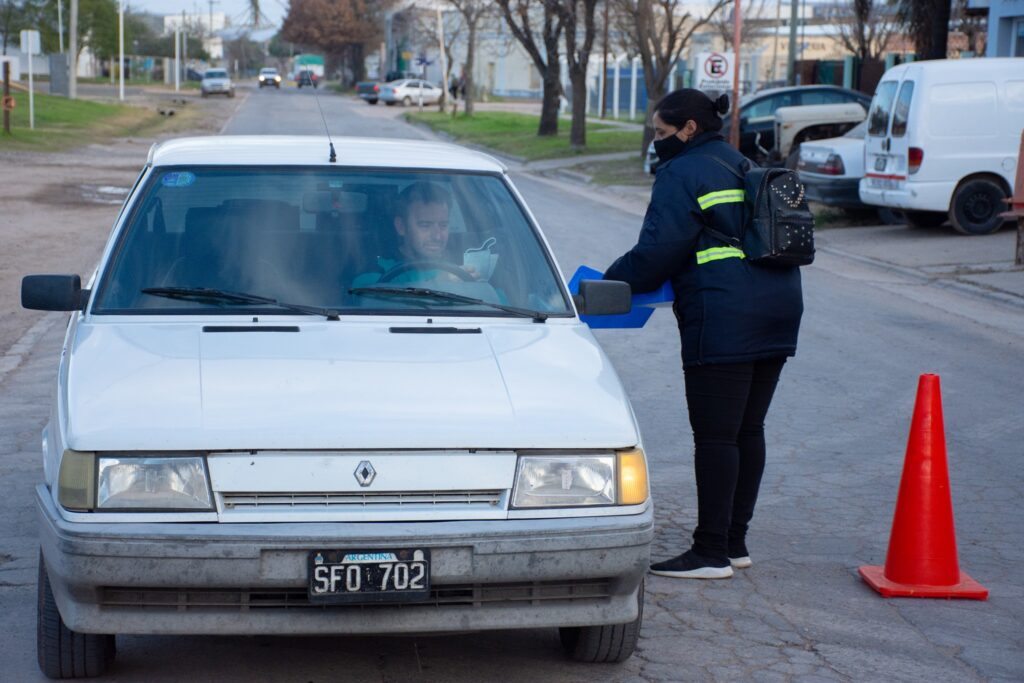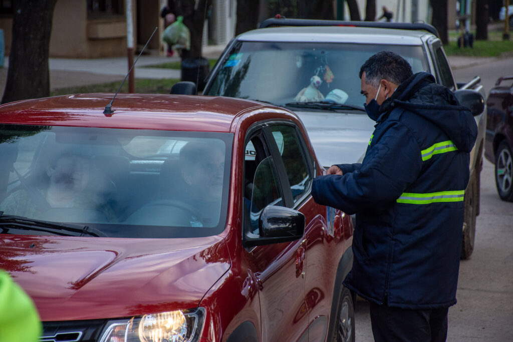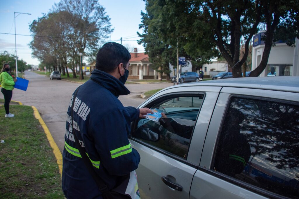 Junto a la campaña y como si se tratase de operativos de tránsito, detienen a los conductores para entregarles los elementos de protección y aprovechan para recordarles las medidas de cuidado personal para evitar contagios de Covid-19.