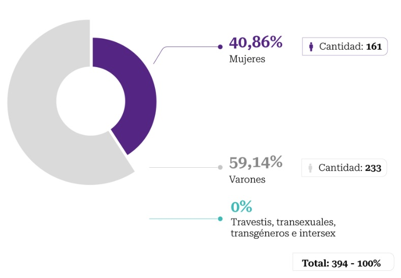 El informe registró que de las 394 personas que trabajaban en los medios relevados a agosto de 2023, un 40,86% son mujeres y un 59,14%, varones. Además, reveló un 0% de personas travestis, transexuales, transgénero o intersex, un dato relevante ya que la Ley establece una proporción no inferior al 1%, al menos en los públicos.
