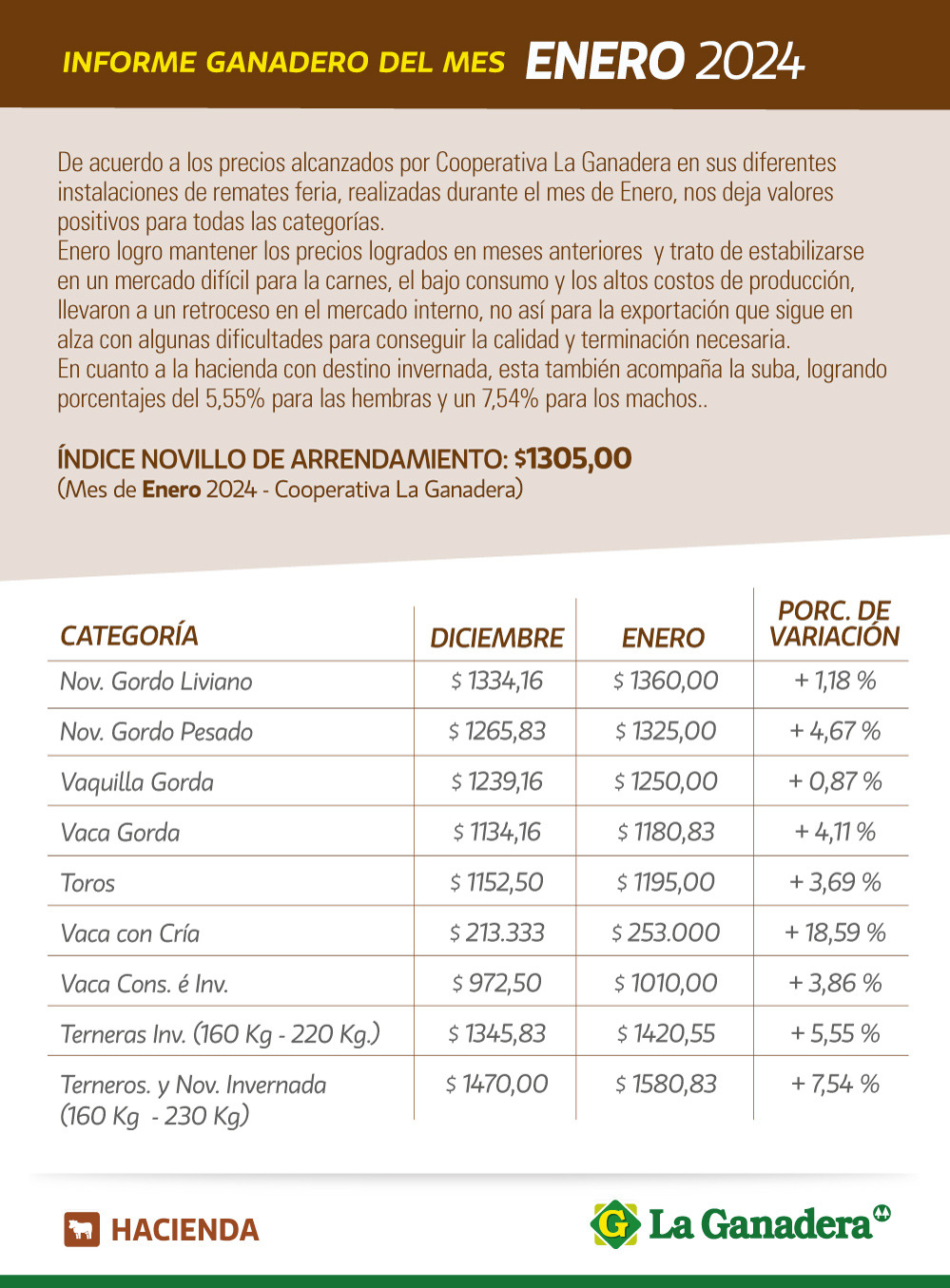 De acuerdo a los precios alcanzados por Cooperativa La Ganadera en sus diferentes instalaciones de remates feria, realizadas durante el mes de enero, se observan valores positivos para todas las categorías.