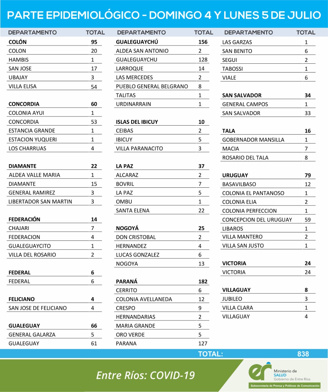 El área de Vigilancia Epidemiológica del Ministerio de Salud, confirmó que en Entre Ríos se registraron 838 nuevos casos de coronavirus, los que corresponden a la suma de dos días: 502 del domingo y 336 del lunes 5 de julio.