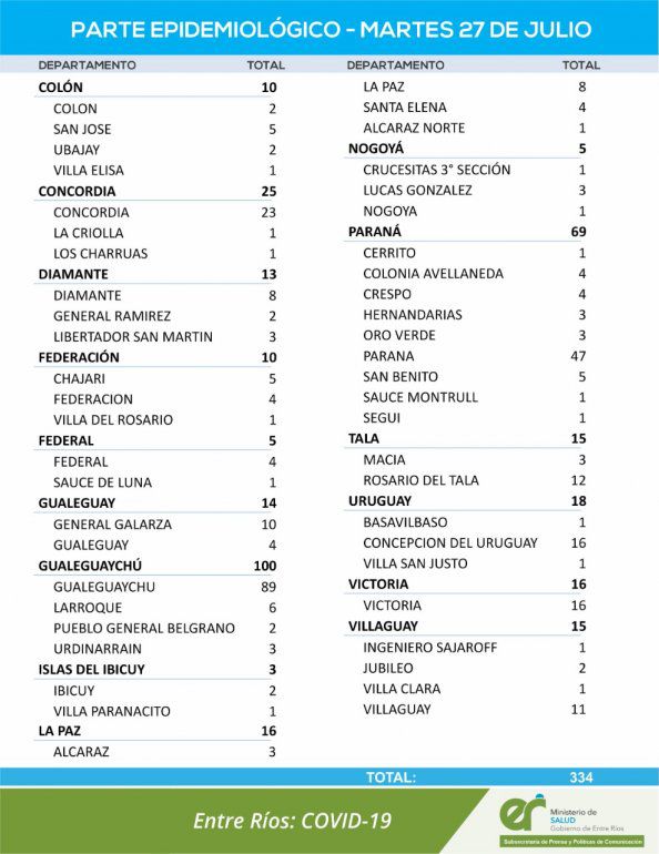 El área de Vigilancia Epidemiológica del Ministerio de Salud, confirmó que este martes en Entre Ríos se registraron 334 nuevos casos de coronavirus.