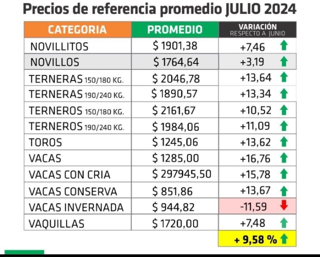 Salvo las vacas de invernada, todas las categorías relevadas por Farer mostraron aumentos de precios respecto de junio. En ese marco, las que más crecieron fueron vacas (+16,76%), vacas con cría (+15,78%), vacas conserva (+13,67% ), terneras entre 150 y 180 kilos (+13,64%), toros (+13,62%), y terneras entre 120 y 240 kilos (+13,34%).