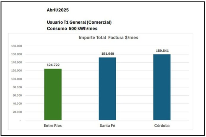 En el sector comercial, las pequeñas y medianas empresas (categoría T1G) en Entre Ríos pagan tarifas un 21,82 por ciento más competitivas que en Córdoba y un 17,91 por ciento más bajas que en Santa Fe, para un consumo de 500 kWh mensuales (datos de abril de 2025).