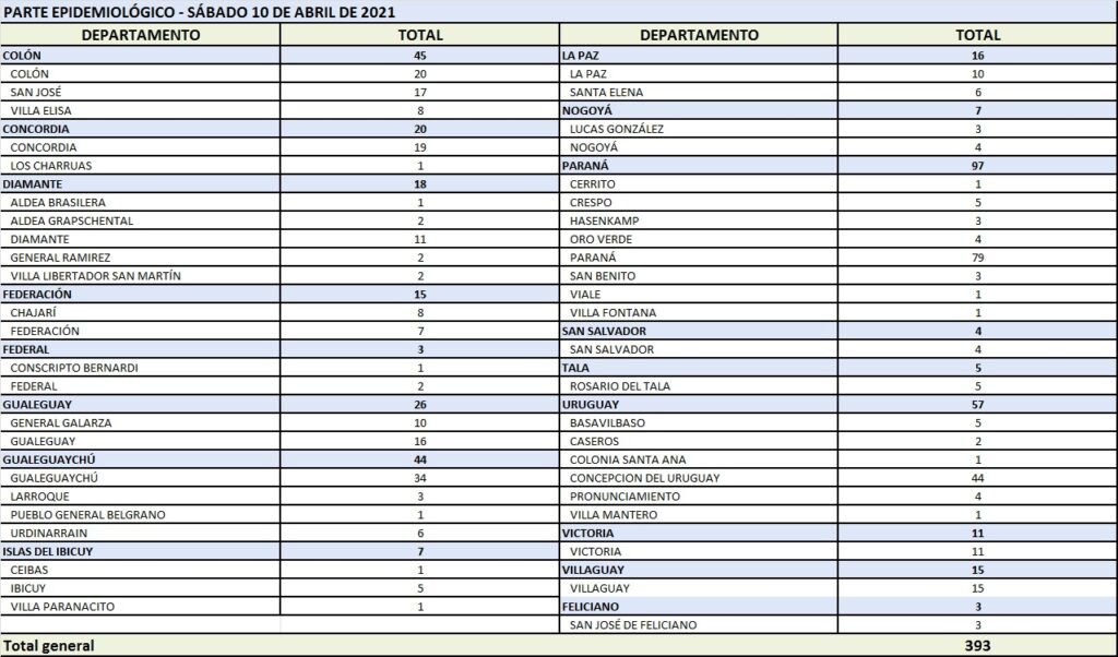 En virtud de los datos reportados este sábado por el área de Vigilancia Epidemiológica del Ministerio de Salud, en Entre Ríos se han sumado 393 casos de coronavirus.
