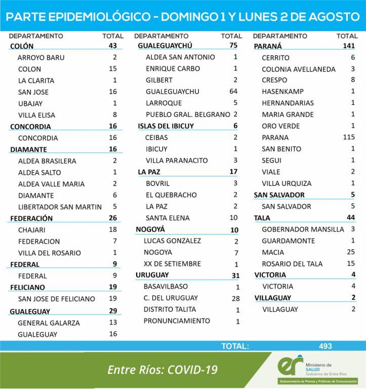 En virtud de los datos reportados por el área de Vigilancia Epidemiológica del Ministerio de Salud, en Entre Ríos se han sumado 493 casos de coronavirus.