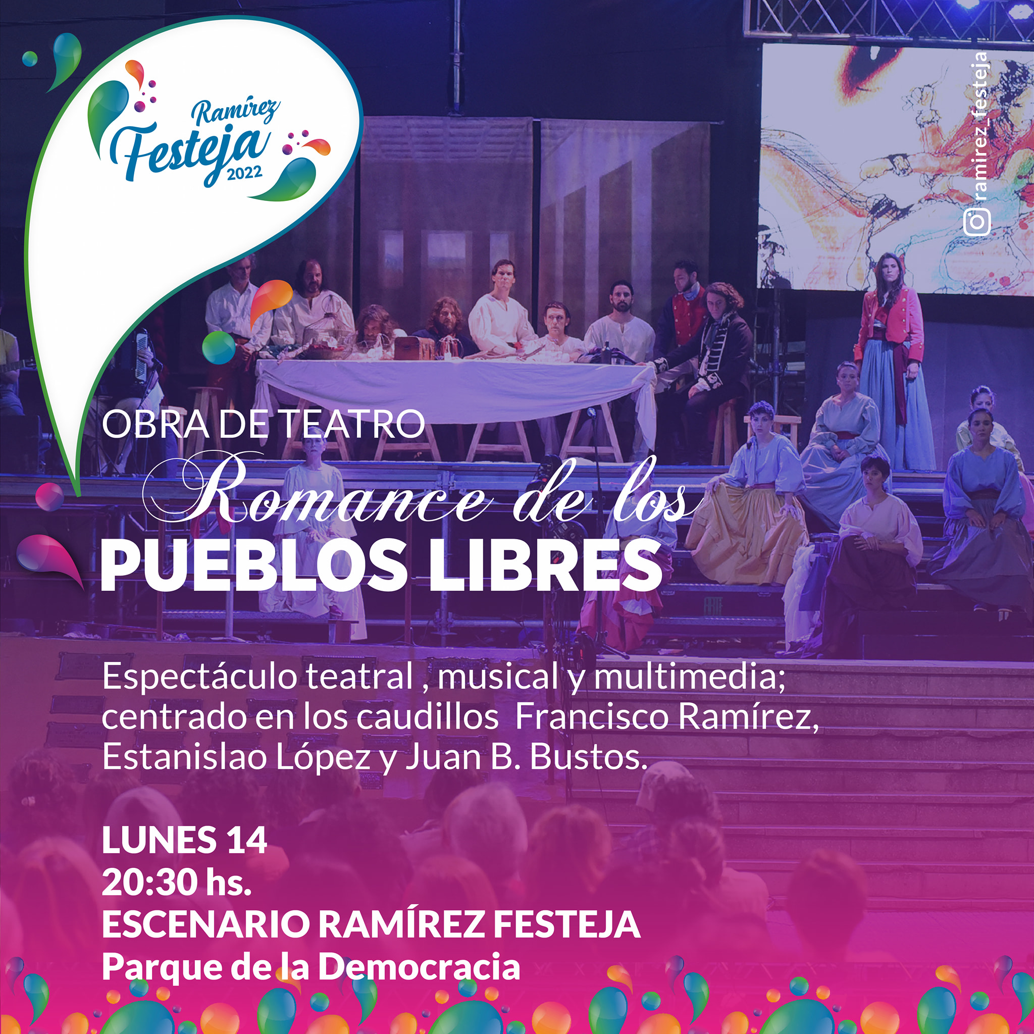 Este lunes 14 de marzo desde las 20.30 se presentará El Romance de los Pueblos Libres en General Ramírez. Será a partir de las 20:30 en el Parque de la Democracia.