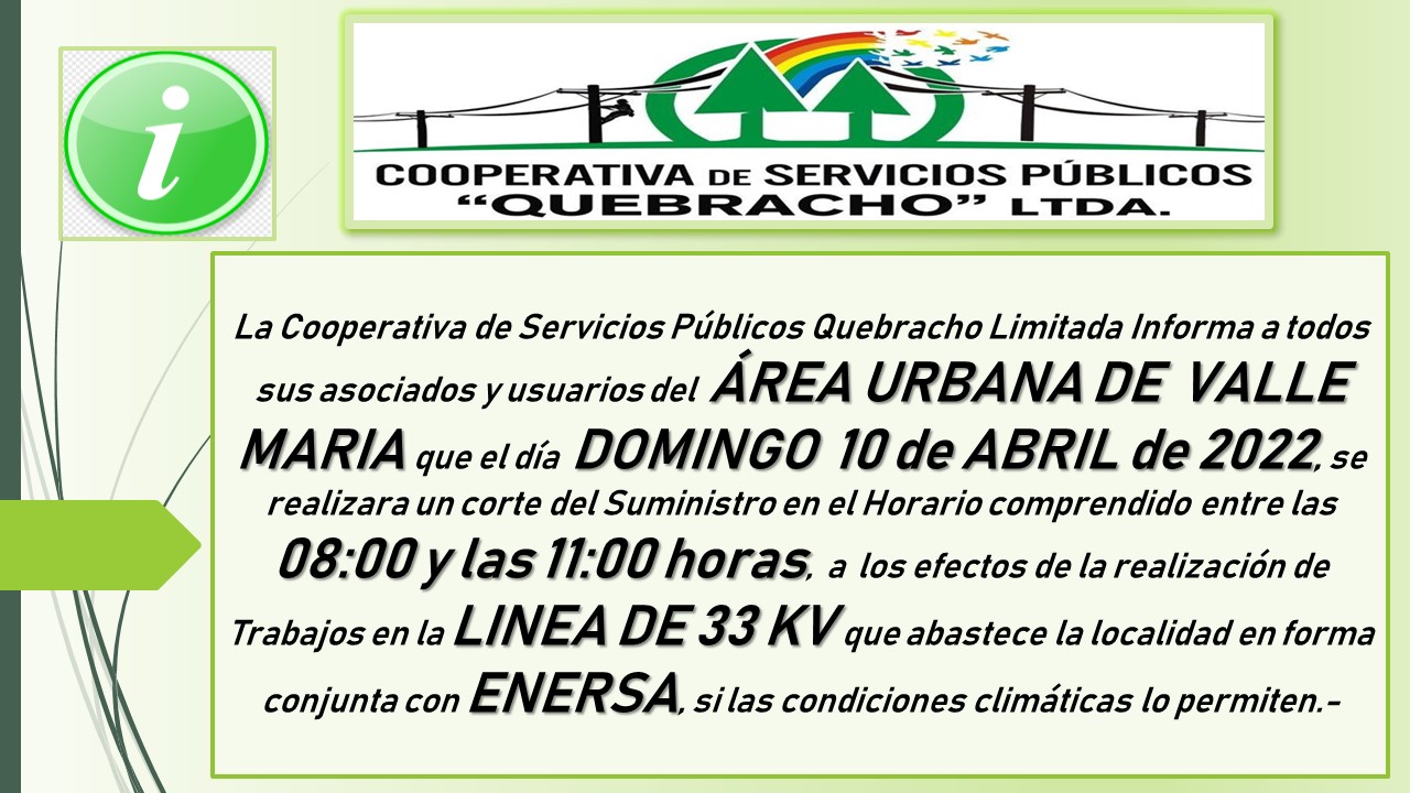 La Cooperativa de Servicios Públicos, Quebracho Limitada informó que el domingo 10 de abril de 8 a 11 se producirá un corte de energía eléctrica, programado para realizar tareas de mantenimiento. Afectará a usuarios de la zona urbana de Valle María.