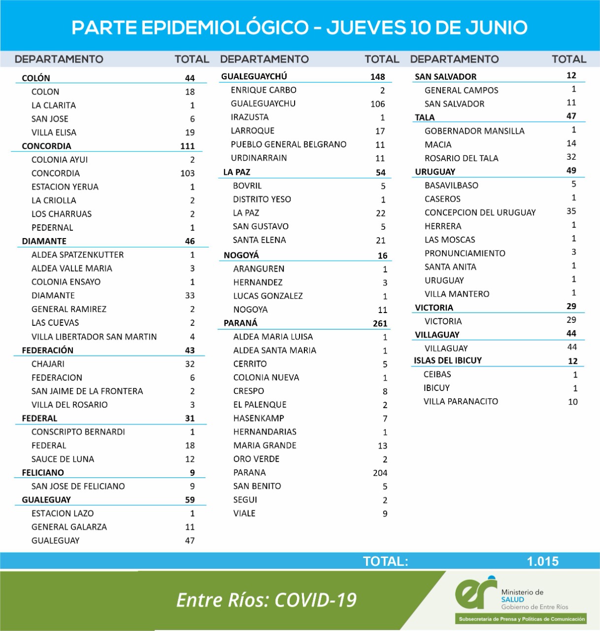 El área de Vigilancia Epidemiológica del Ministerio de Salud, confirmó que en Entre Ríos este jueves se registraron 1.015 nuevos casos de coronavirus.