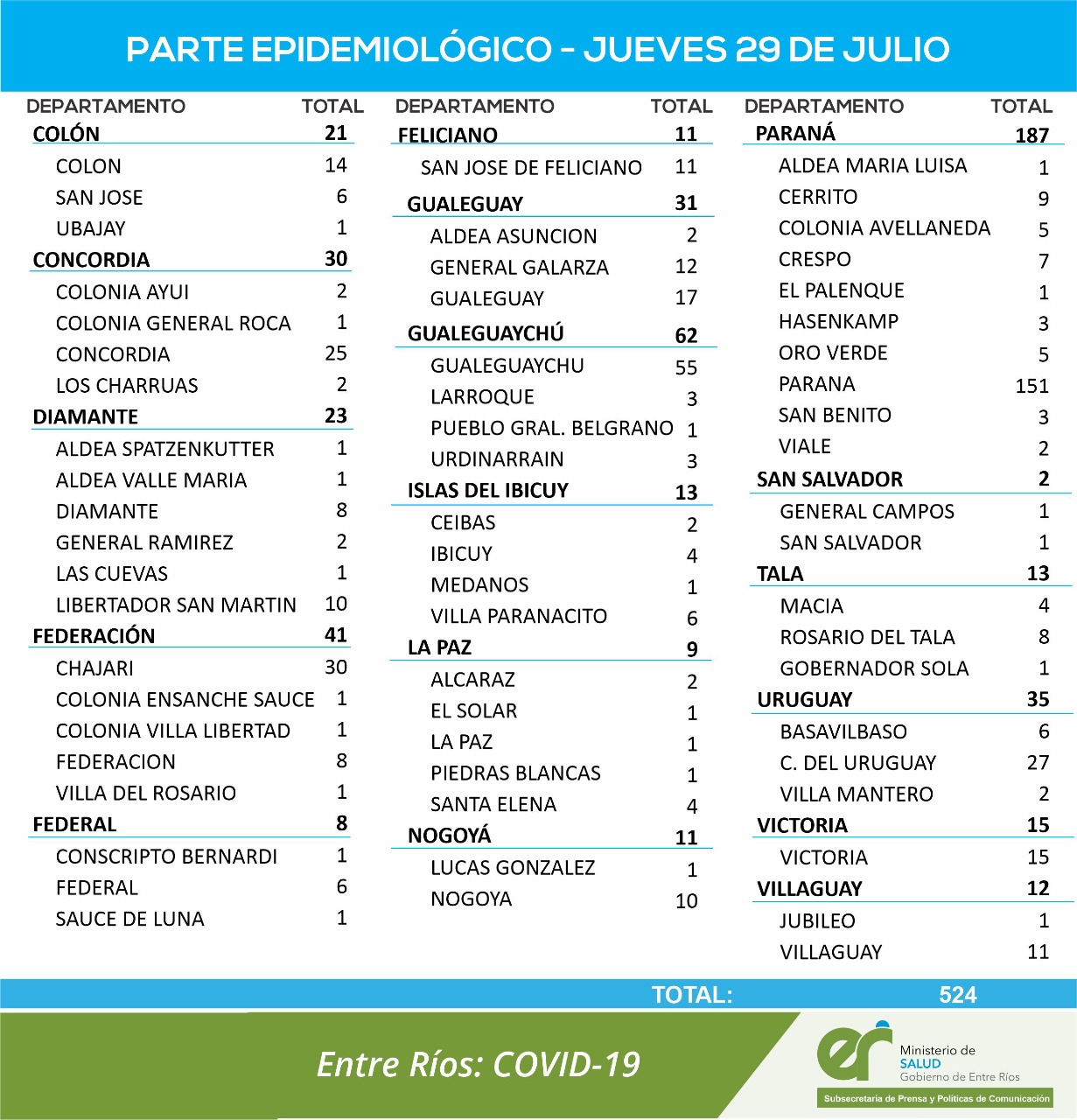 El área de Vigilancia Epidemiológica del Ministerio de Salud, confirmó que en Entre Ríos este jueves se registraron 524 nuevos casos de coronavirus.