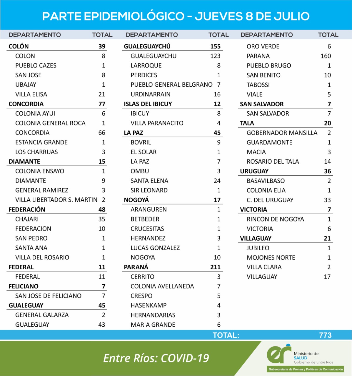 El área de Vigilancia Epidemiológica del Ministerio de Salud, confirmó que en Entre Ríos este jueves se registraron 773 nuevos casos de coronavirus.