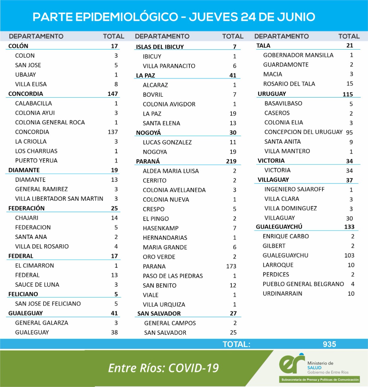 El área de Vigilancia Epidemiológica del Ministerio de Salud, confirmó que en Entre Ríos este jueves se registraron 935 nuevos casos de coronavirus.