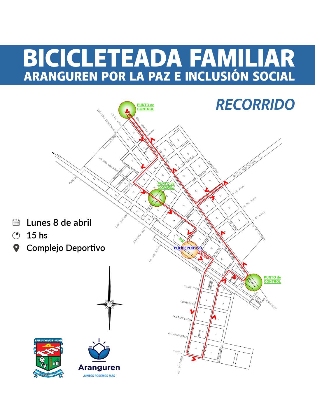 «Aranguren por la paz e inclusión social». Ese es el lema de la bicicleteada familiar que se realizará en Aranguren este lunes 8 de abril desde las 15. El punto de partida será el Complejo Deportivo Municipal y recorrerá las principales arterias de la ciudad.