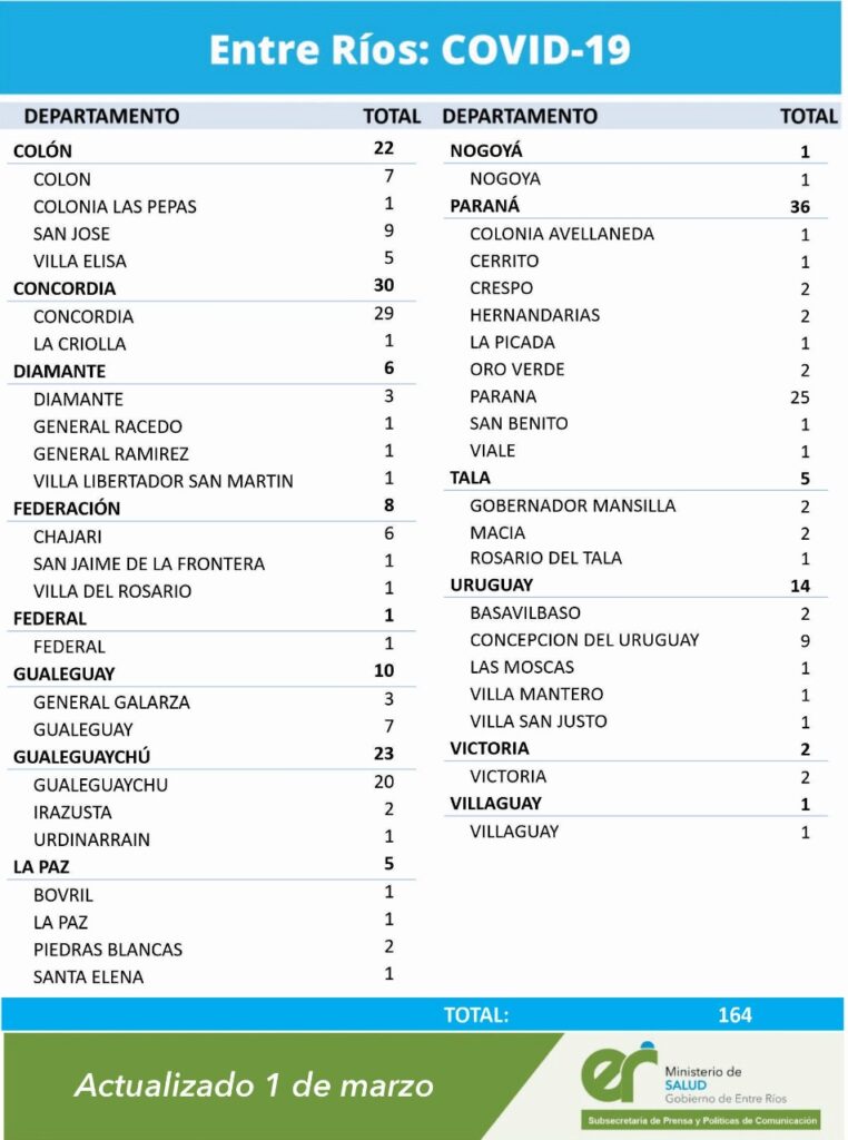 El área de Vigilancia Epidemiológica del Ministerio de Salud, confirmó que en Entre Ríos este lunes se registraron 164 nuevos casos de coronavirus.