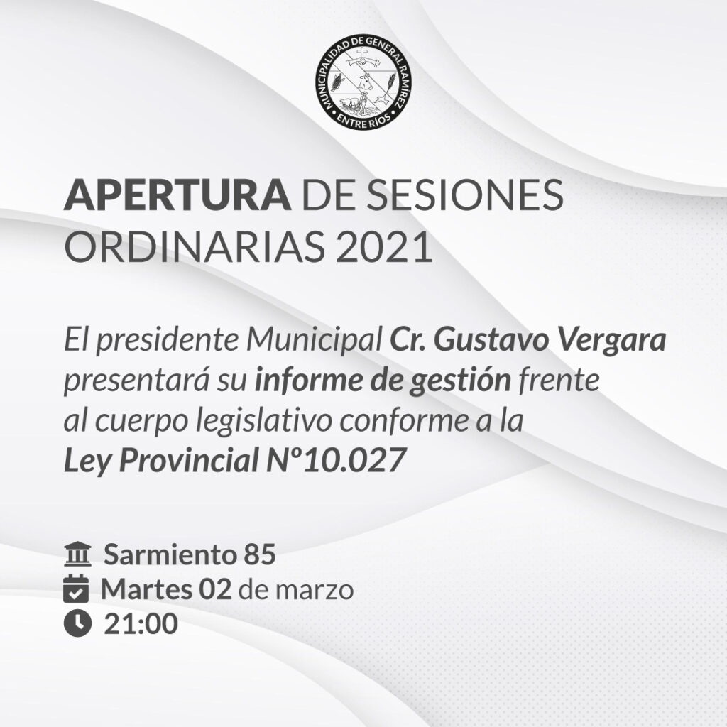 Este martes 2 de marzo a las 21:00, frente al edificio del Honorable Concejo Deliberante -Sarmiento 85- se llevará a cabo la Apertura de Sesiones Ordinarias del período 2021 en General Ramírez.