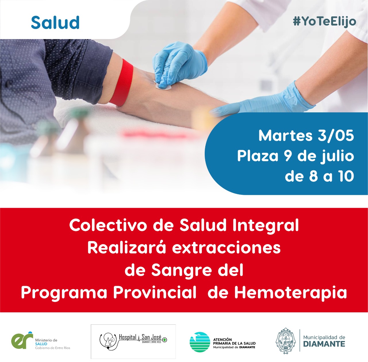 El martes 3 de mayo, el Colectivo de Salud Integral estará en Plaza 9 de Julio realizando las extracciones de sangre en el marco del Programa Provincial de Hemoterapia.