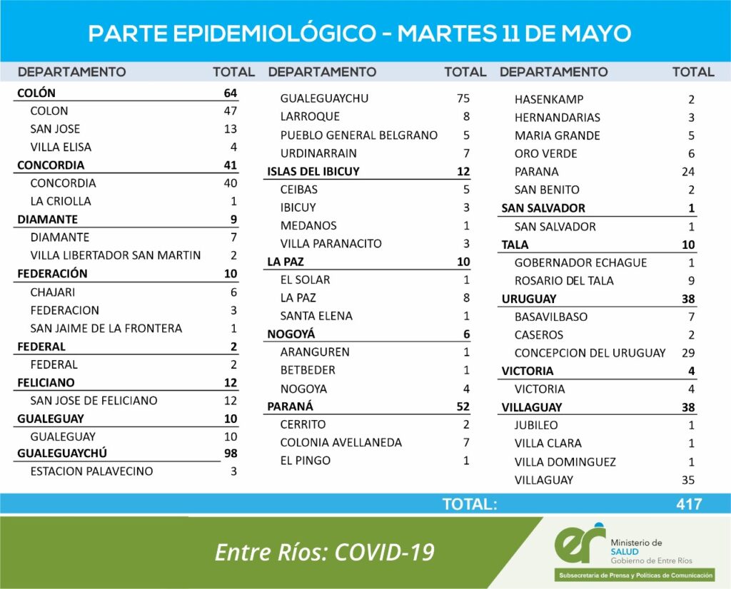 El área de Vigilancias Epidemiológica del Ministerio de Salud, confirmó que en Entre Ríos entre este martes se registraron 419 nuevos casos de coronavirus.