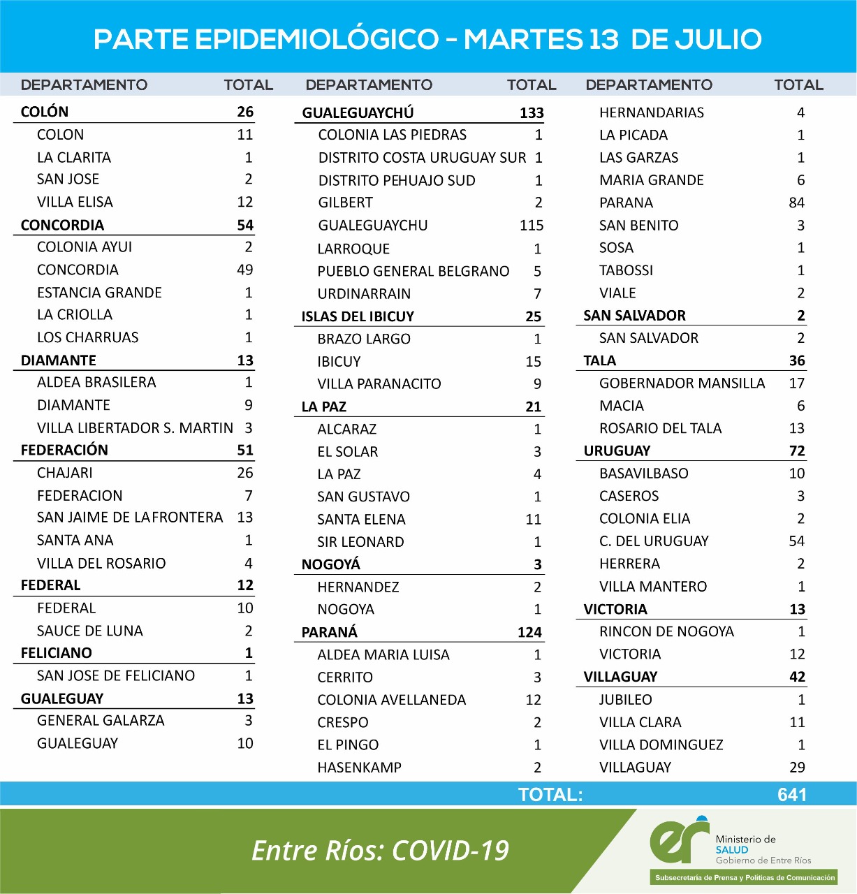 El área de Vigilancia Epidemiológica del Ministerio de Salud, confirmó que en Entre Ríos este martes se registraron 641 nuevos casos de coronavirus.