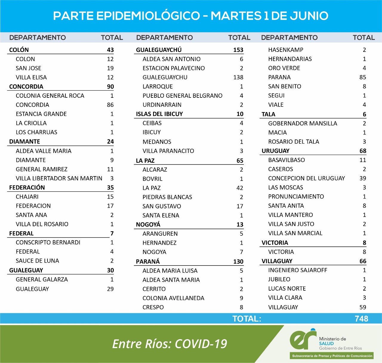 El área de Vigilancias Epidemiológica del Ministerio de Salud, confirmó que en Entre Ríos este martes 748 nuevos casos de coronavirus en Entre Ríos.