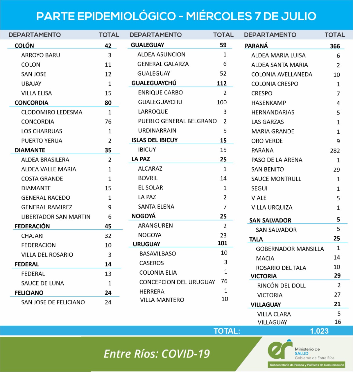 El área de Vigilancia Epidemiológica del Ministerio de Salud, confirmó que en Entre Ríos este miércoles se registraron 1023 nuevos casos de coronavirus.