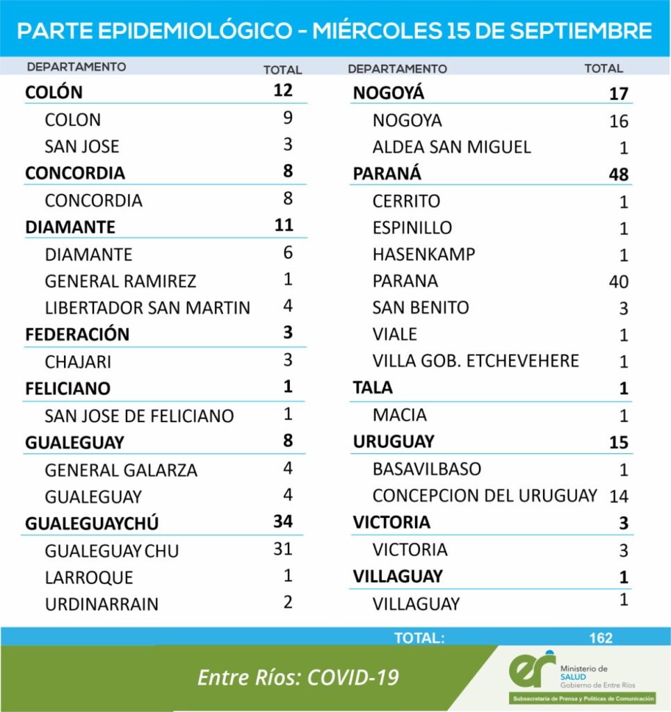 El área de Vigilancia Epidemiológica del Ministerio de Salud confirmó que en Entre Ríos este miércoles 15 de septiembre se registraron 162 nuevos casos de coronavirus.